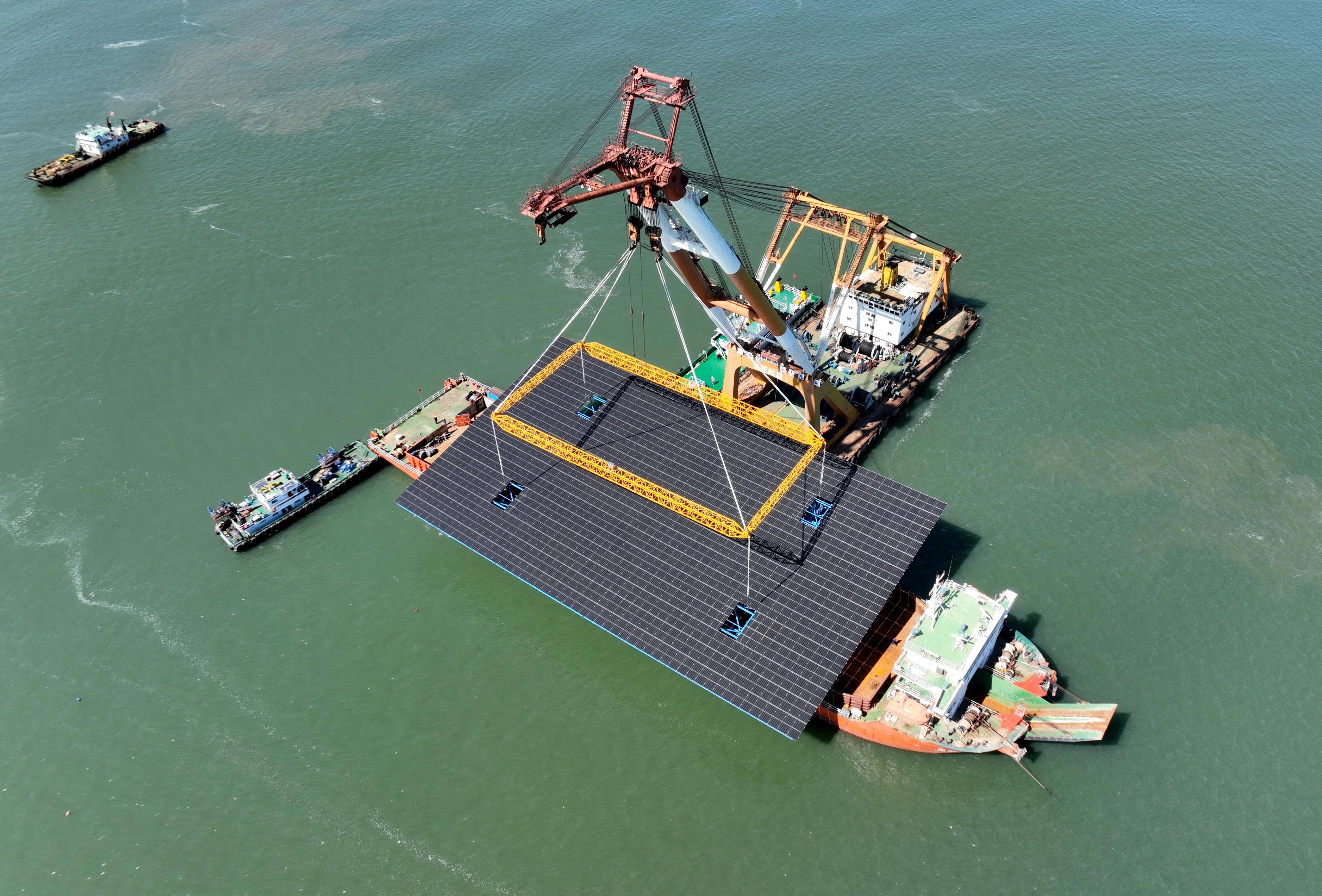 9月18日,一艘轮船在河北省昌黎县海域光伏发电场建设工地运送光伏发电板(无人机照片)。