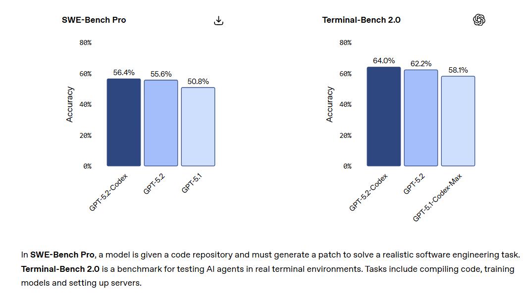 OpenAI介绍,GPT-5.2-Codex在编码性能、网络安全能力和长周期任务处理上均实现突破。GPT-5.2-Codex在SWE-Bench Pro测试中准确率达到56.4%,在Terminal-Bench 2.0测试中达到64.0%,刷新两项基准测试纪录。该模型已于发布当天在所有Codex界面向付费ChatGPT用户开放,API用户接入正在推进中。