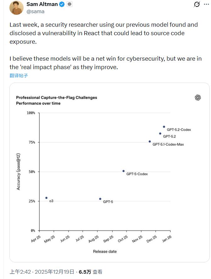 OpenAI特别强调GPT-5.2-Codex在网络安全方面的显著提升。CEO Sam Altman提到,本月早些时候,一名安全研究人员使用上一代模型GPT-5.1-Codex-Max就发现并负责任地披露了React中可能导致源代码暴露的漏洞。OpenAI方面认为,新模型尚未达到“高”级别网络安全能力,但公司正在为未来模型跨越这一门槛做准备。